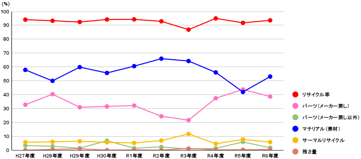 | リサイクル率 | 94.1 | 93.3 | 92.4 | 94.2 | 94.3 | 92.9 | 86.9 | 95.0 | 91.8 | 93.6 |